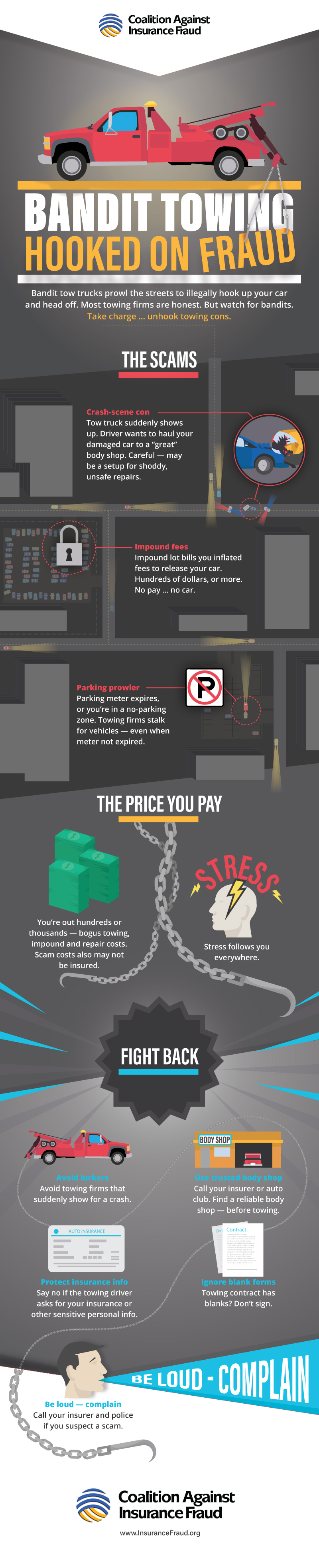 This infographic was created to raise awareness about the deceptive practices of “bandit towing”—a scam where tow truck operators arrive uninvited at accident scenes, misrepresent their affiliations, and demand exorbitant fees to release vehicles. By visually outlining the warning signs and protective measures, the goal was to empower drivers to recognize and avoid such fraudulent activities.